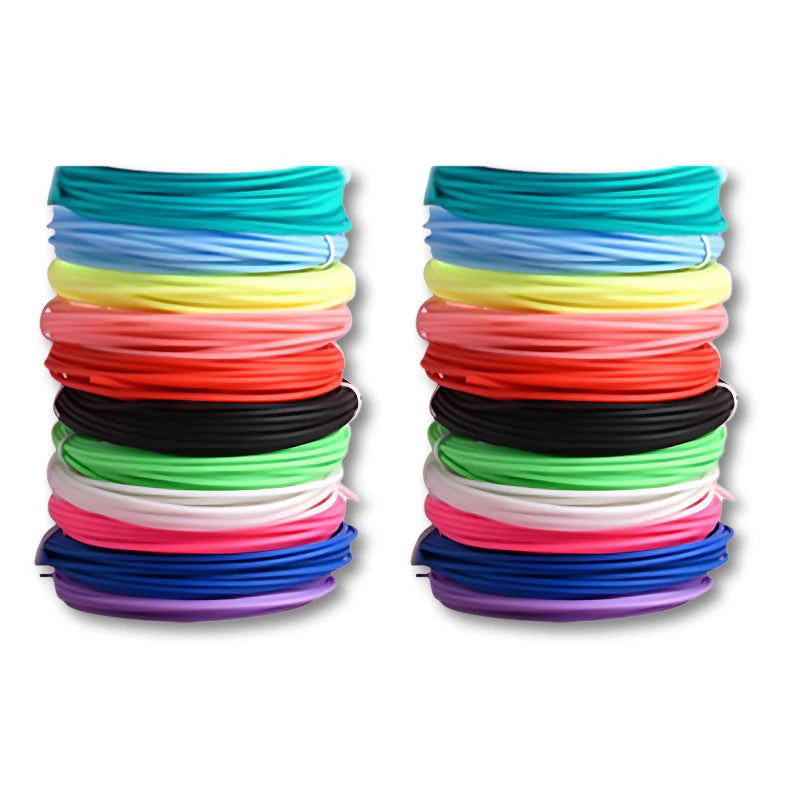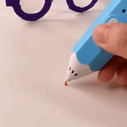 Włóż filament PLA, włącz długopis i ustaw prędkość podawania. Po krótkim nagrzaniu możesz rysować na macie lub „w powietrzu”, łącząc linie w bryły. Regulacja przepływu pomaga przełączać się między solidnymi kształtami a delikatnymi detalami.