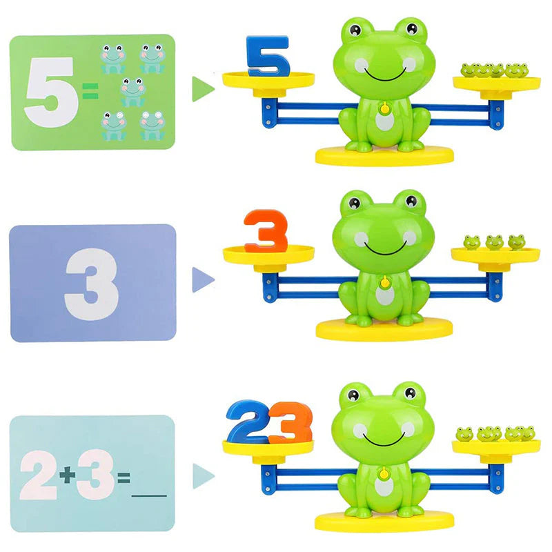 Dziecko kładzie na tackach żabki i cyfry, obserwuje, kiedy szalka wraca do poziomu i w naturalny sposób rozumie równość, większe–mniejsze oraz podstawy dodawania i odejmowania. Metoda „ręce robią – głowa rozumie” idealnie wpisuje się w Montessori.